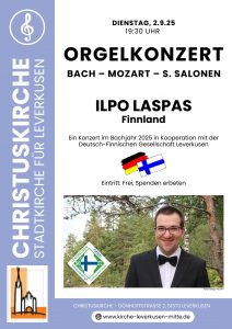 An sechs verschiedenen Orten, in sechs verschiedenen Kirchen wird uns der Ausnahmeorganist seine Interpretationen der „alten Meister“, der berühmten Komponisten zu Gehör bringen. Wo nun die Konzerte stattfinden, könnt ihr den Plakaten entnehmen. Wie ihr seht, von Ahlen, Leverkusen über Velbert nach Münster, Soest und zum Schluß dann in Bergkamen, Ilpo Laspas wird in einem großen Bogen durch NRW reisen, unterstützt auch durch die Bezirksgruppen Münster, Leverkusen, Düsseldorf, Hochsauerland und Bochum-Witten.